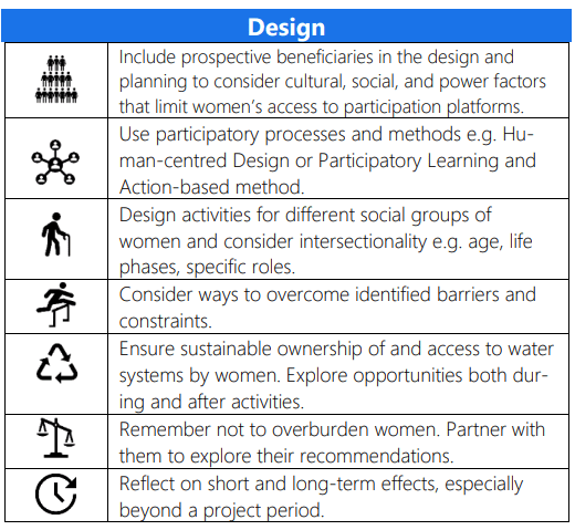 The document is enriched by many concrete examples. For instance, the importance of exploring existing structures and power dynamics is illustrated by an example of Nepal with the use of existing mothers groups for rainwater harvesting, and the one of traditional women musical groups and women farmer’s groups in South Sudan.