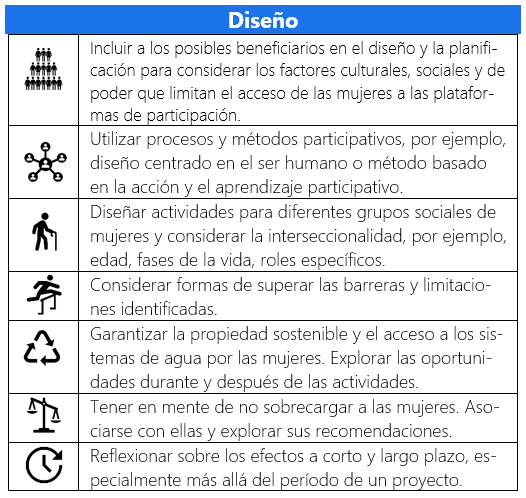 El documento se enriquece con muchos ejemplos concretos. Por ejemplo, la importancia de explorar las estructuras existentes y las dinámicas de poder se ilustra con un ejemplo de Nepal con el uso de los grupos de madres existentes para la recogida de agua de lluvia, y otre ejemplo con grupos de mujeres de músicas tradicionales y grupos de mujeres agricultoras en Sudán del Sur.