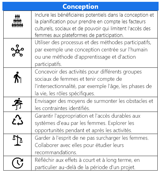 Le document est enrichi de nombreux exemples concrets. Par exemple, l’importance d’explorer les structures existantes et les dynamiques de pouvoir est illustrée par un exemple au Népal avec l’utilisation des groupes de mères existants pour la collecte des eaux de pluie, et celui des groupes musicaux traditionnels de femmes et des groupes d’agricultrices au Soudan du Sug.