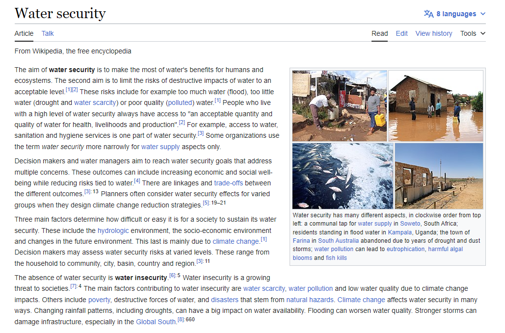 This can be based on the needs of my clients (for my paid editing work). The REACH program wanted to see improvements made to Wikipedia articles that touch on climate resilient WASH topics, e.g. the Wikipedia articles on water security, WASH, effects of climate change on the water cycle, effects of climate change, groundwater, climate resilience, water supply and sanitation in Bangladesh. So I spent time on those.