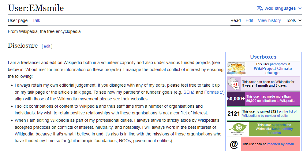 In October 2014, I discovered the work of a Canadian doctor, James Heilman, who was improving articles on pit latrines, sanitation, and toilets simply because he felt it was important. As a sanitation specialist, I realised I could more easily contribute to those topics than him. This inspired me to begin Wikipedia editing. My motivation stems from two directions: volunteer editing and paid freelance editing. Most Wikipedia articles get high pageviews which is evidence that people turn to Wikipedia to find answers to their questions. Also, tools like Alexa and ChatGPT also utilise Wikipedia content (even if they don’t always reveal their sources). The information that is given in Wikipedia articles is quite often not the best and also outdated. I want to help make the “sum of all human knowledge“ available for everyone, especially on topics that I care about such as sanitation and climate change. (Wikipedia co-founder, Jimmy Wales, is famously quoted as asking us to: “Imagine a world in which every single person on the planet is given free access to the sum of all human knowledge”).