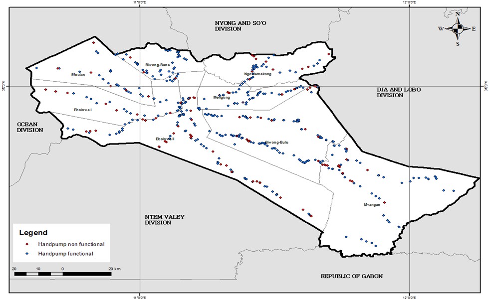 Figure 1. Spatial distribution of handpumps in Mvila Division (Source: Mvongo et al., 2023)