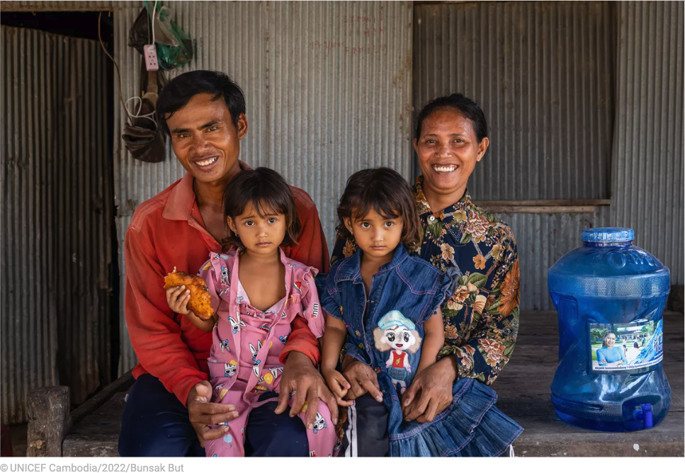 Choum Sophorn poses with her husband and twin four-year-old daughters in her home next to the 20 litre drinking water bottle that is delivered to her home every three days.
