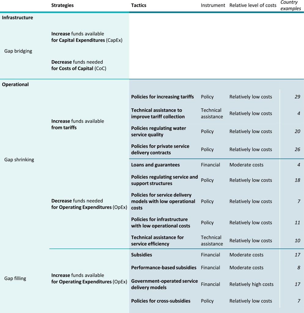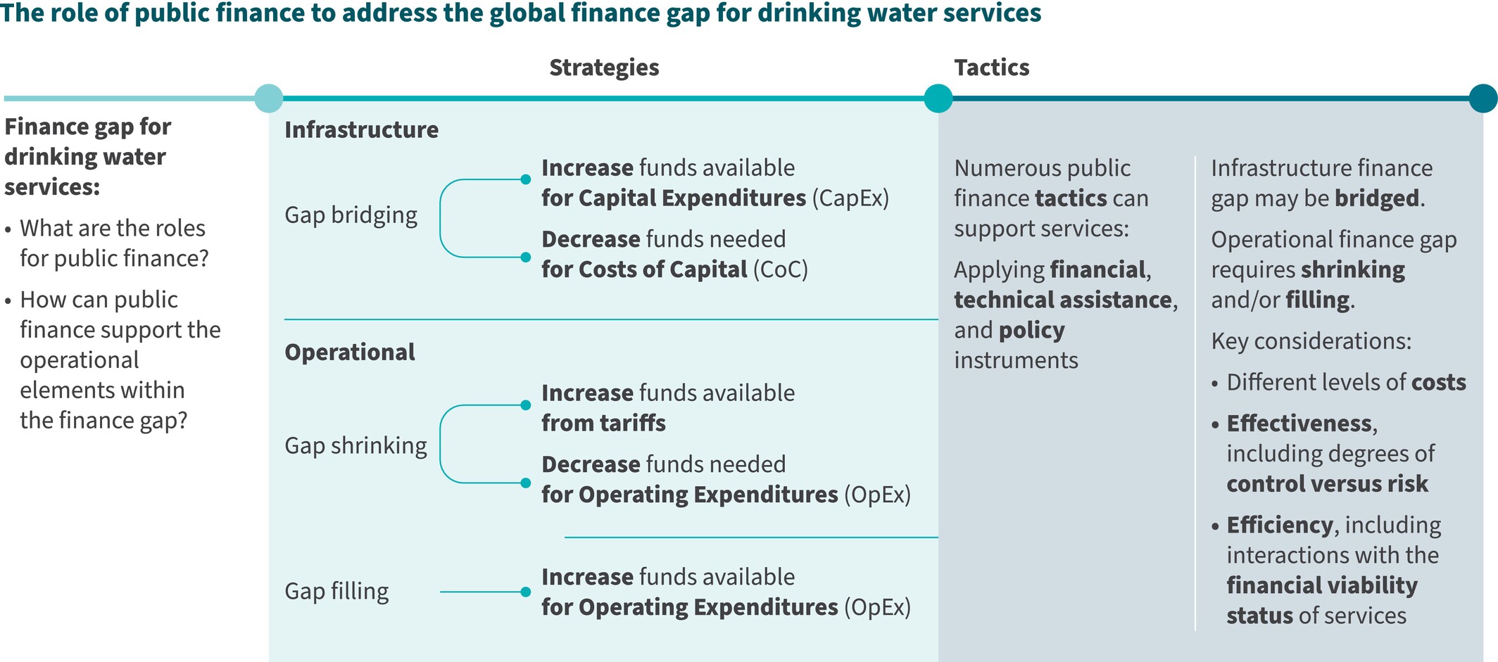 This research suggests a framework of five strategies for bridging, shrinking, and filling the finance gap for drinking water services, based on how the funds available from tariffs, taxes, and transfers compare to the life-cycle costs of services.