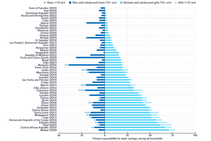 Graph 1 Proportion of households in which women, men, girls and boys are primarily responsible for water collection, by country, selected surveys where at least 10% of households collect water, 2012–2022 (%) Source UNICEF and WHO, 2023